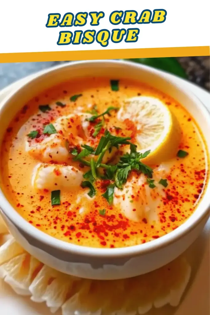 Season with salt and pepper. Serve hot, garnished with chives or parsley and a side of crusty bread. Engaging note: For a fun twist, drizzle with a bit of truffle oil if you’re feeling fancy—it elevates this easy crab bisque to special-occasion status.