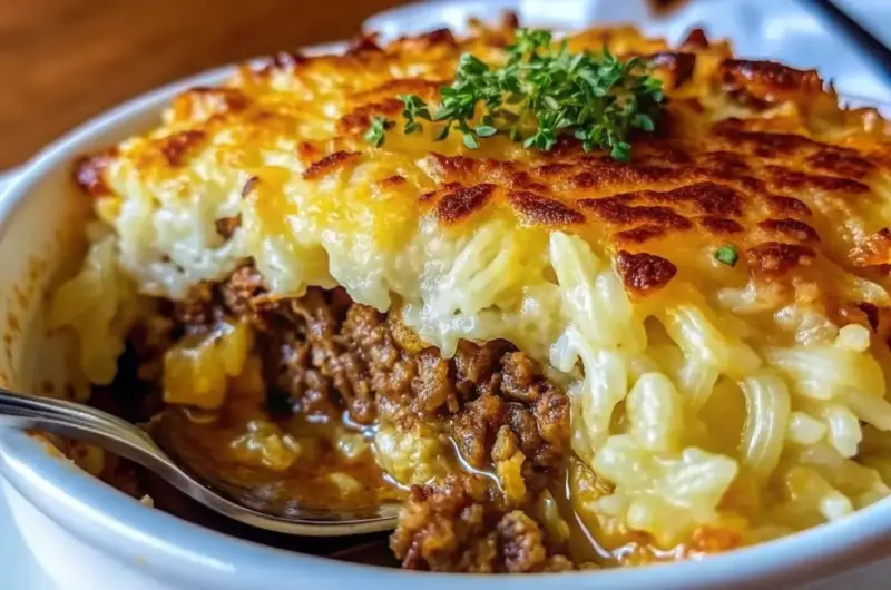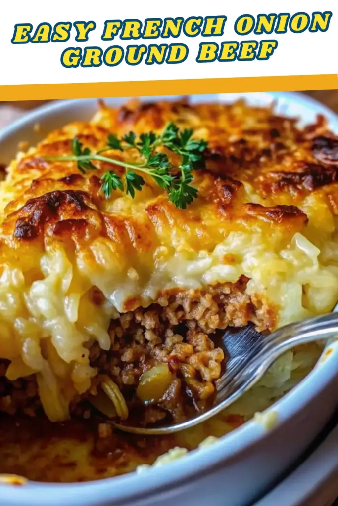 A hearty, comforting French Onion Ground Beef and Rice Casserole blending rich caramelized onion flavor, tender beef, creamy sauce, and bubbly cheese—perfect for busy weeknights and budget-friendly cooking.