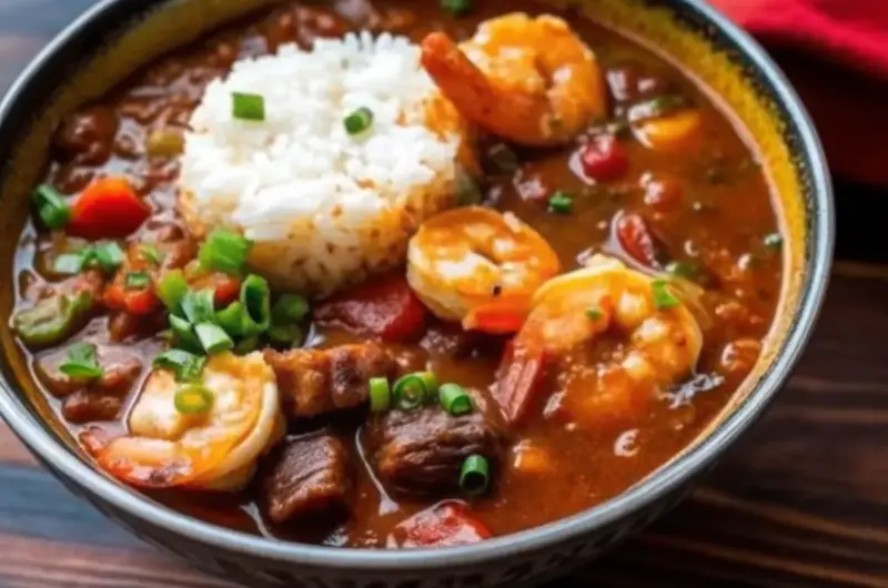 Louisiana Seafood Gumbo is a bold, iconic Cajun seafood stew made with a rich roux, fresh seafood, spicy seasonings, and vegetables that bring deep Southern flavor straight from Louisiana’s bayous.