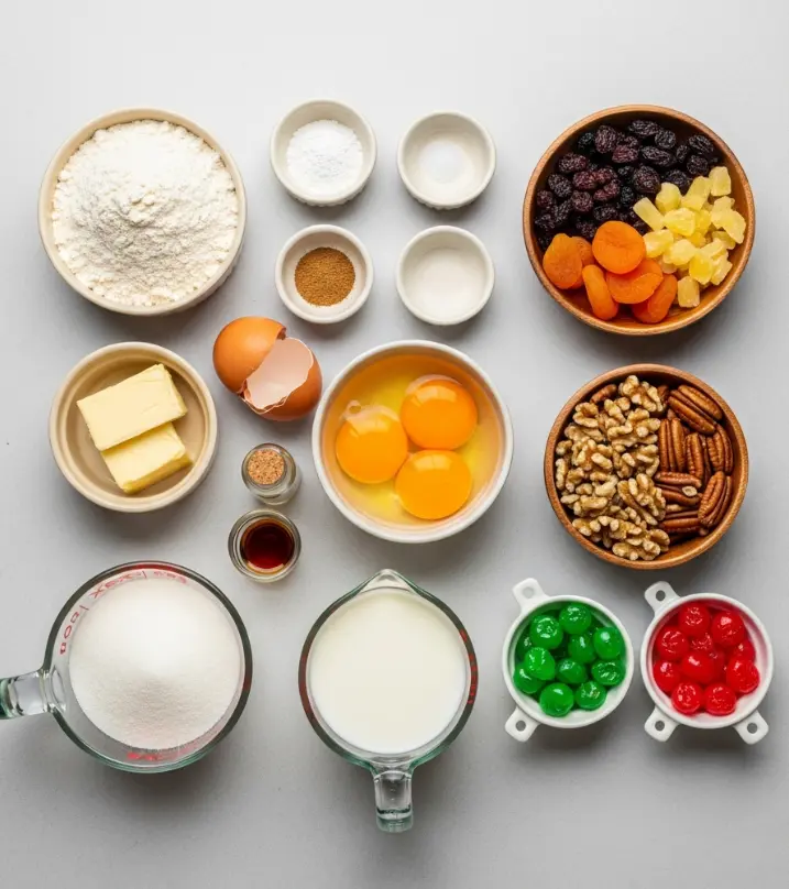 Creating this Traditional Christmas Fruit Cake Recipe starts with gathering high-quality ingredients that evoke the warmth of the holidays. I’ve organized them into categories for clarity, with sensory descriptions to get your taste buds tingling—think plump, juicy dried fruits mingling with crunchy nuts and velvety butter. This recipe serves 8-10 people and yields one hearty loaf. For substitutions, I’ve included options to personalize it for dietary tweaks, like gluten-free swaps or vegan alternatives.