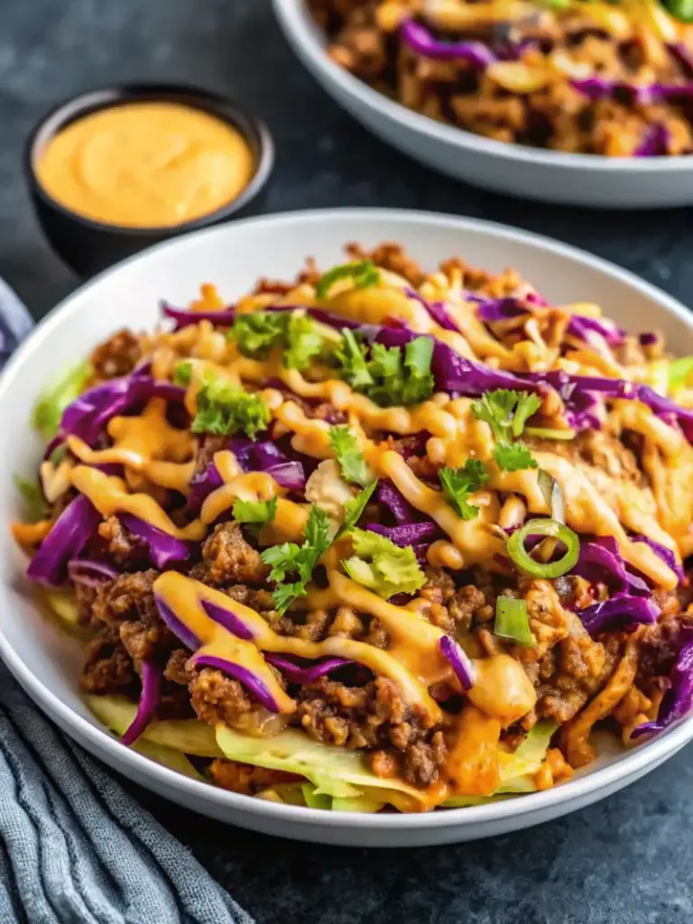 A quick, low-carb deconstructed egg roll made with ground pork, crisp cabbage, garlic, ginger, and topped with a creamy chili sauce—ready in under 25 minutes.