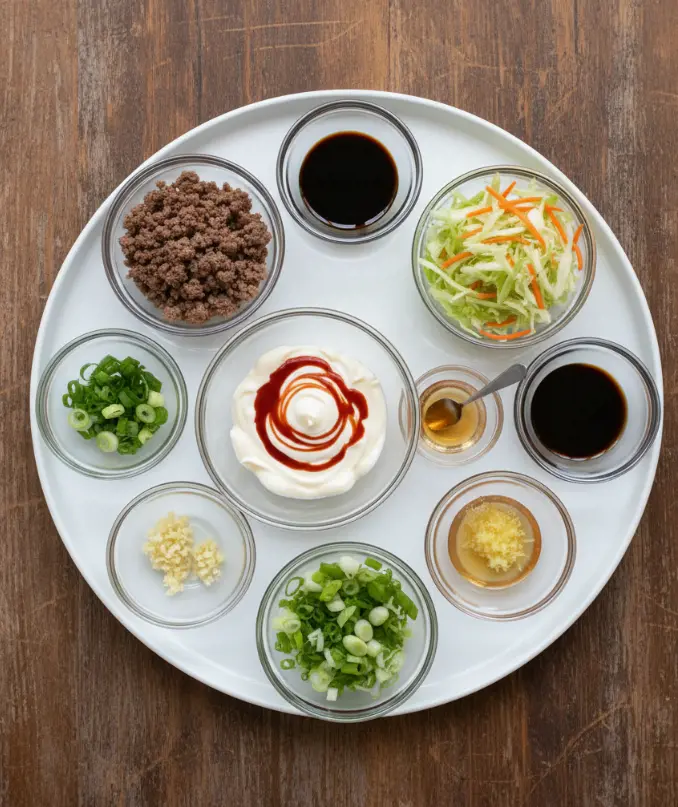 Creating this Egg Roll in a Bowl with Creamy Chili Sauce starts with fresh, accessible ingredients that evoke the sensory delight of an Asian-inspired feast—the crunch of veggies, the aroma of garlic and ginger, and the creamy heat of sriracha. Here’s what you’ll need for 4 servings: