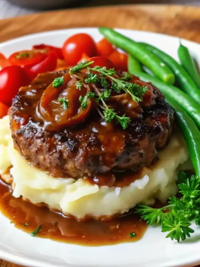 This classic hamburger steak recipe delivers juicy ground beef patties smothered in rich caramelized onion gravy, bringing nostalgic diner-style comfort to your table in just 40 minutes.