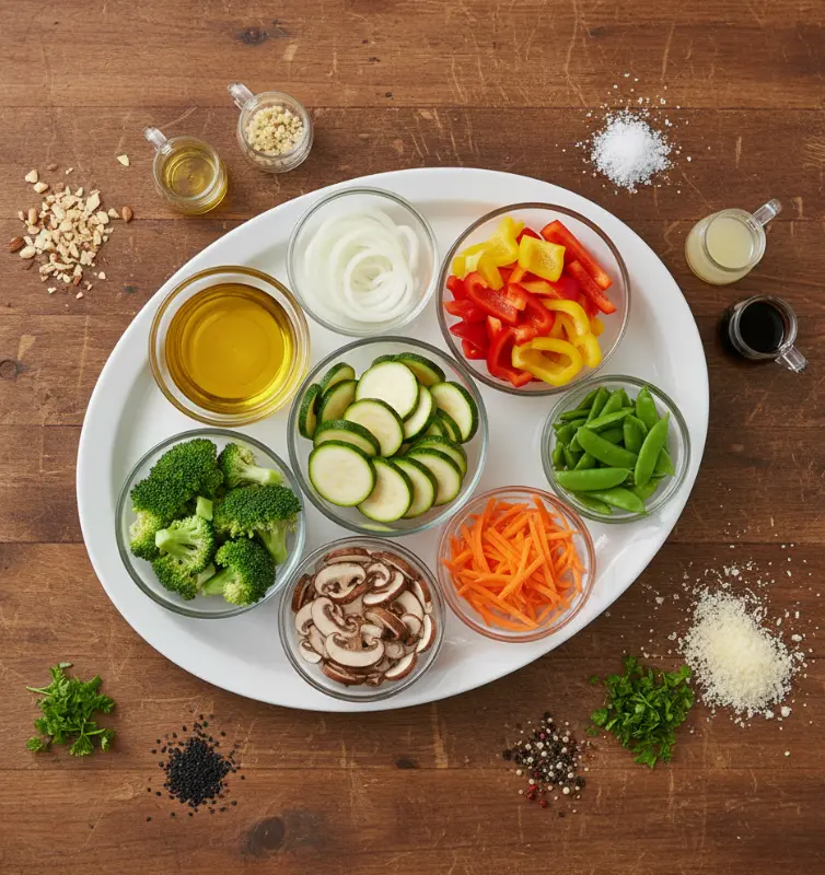 Wash all vegetables thoroughly under cold running water. Pat dry with clean kitchen towels to prevent oil splattering. Cut vegetables into uniform pieces (roughly ½-inch thick) to ensure even cooking. Group your vegetables by cooking time: hard vegetables (carrots, broccoli) in one bowl, and softer vegetables (zucchini, bell peppers, snap peas) in another.