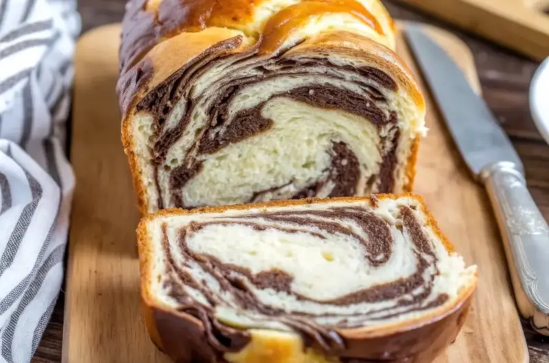 A soft, fluffy, bakery-style Chocolate Marble Bread swirled with rich chocolate and vanilla dough, perfect for breakfast, brunch, or a cozy homemade treat.