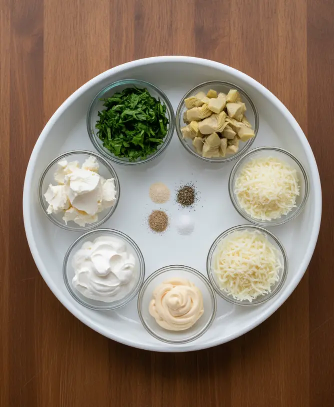 Transform your kitchen into a gourmet appetizer station with these carefully selected ingredients for the perfect Spinach and Artichoke Dip: