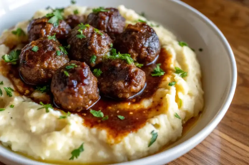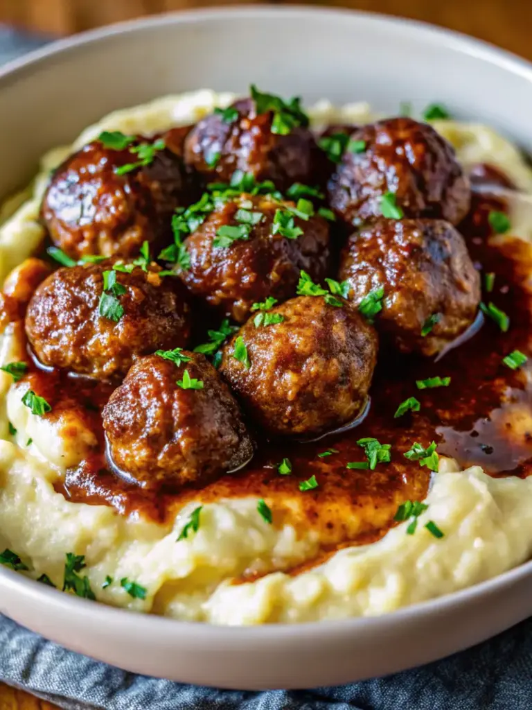 A comforting, modern twist on classic Salisbury steak featuring juicy meatballs, rich gravy, and creamy garlic herb mashed potatoes for the perfect homestyle dinner.